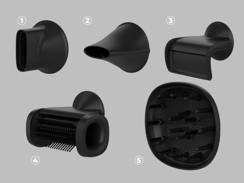 Fén AENO HD5 nabízí všestranné možnosti úpravy vlasů díky pěti snadno vyměnitelným magnetickým nástavcům: