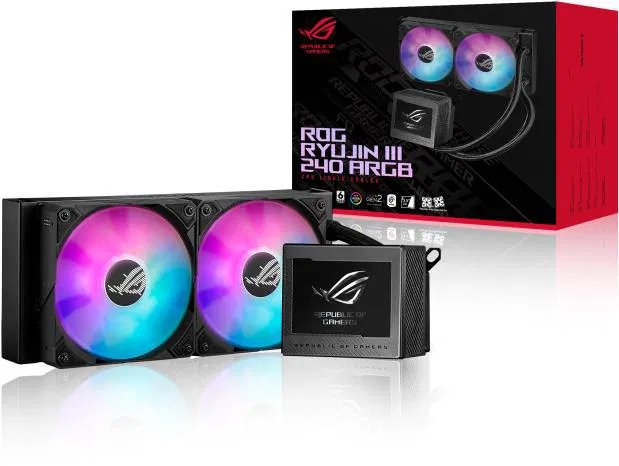 ROG Ryujin III 240 ARGB je špičkový 240 mm all-in-one kapalinový chladič s 3,5” barevným LCD, který v reálném čase zobrazuje teploty, otáčky, systémová data nebo vlastní GIF/obrázky. Uvnitř pracuje Asetek 8. generace s třífázovým motorem, a na pumpě je vestavěný Axial-tech VRM ventilátor pro snížení teplot napájecí kaskády základní desky. Minimalistický vzhled doplňuje ARGB osvětlení ventilátorů.