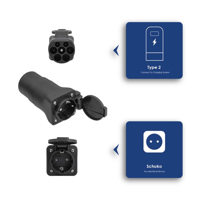 Produkt má robustní konstrukci s pevnými a odolnými kontakty a zajišťuje bezpečné připojení mezi EV nabíječkou a standardní Schuko zásuvkou.
