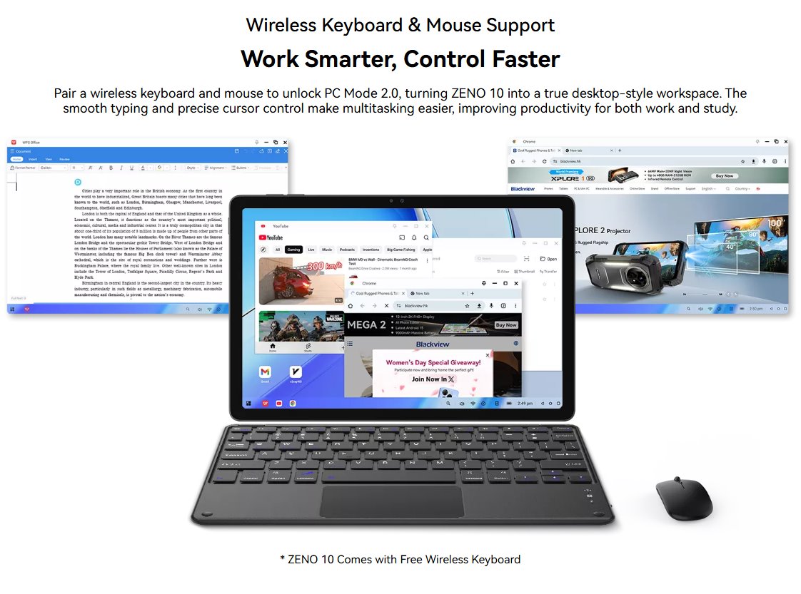 Blackview Zeno 10 5G je moderní tablet navržený pro každodenní práci, studium i multimediální zábavu. Kombinuje velký displej, podporu mobilních sítí 5G a dostatečný výkon pro běžné aplikace, multitasking i streamování videa. Díky tenkému provedení a příjemné hmotnosti je vhodný pro přenášení i delší používání na cestách.