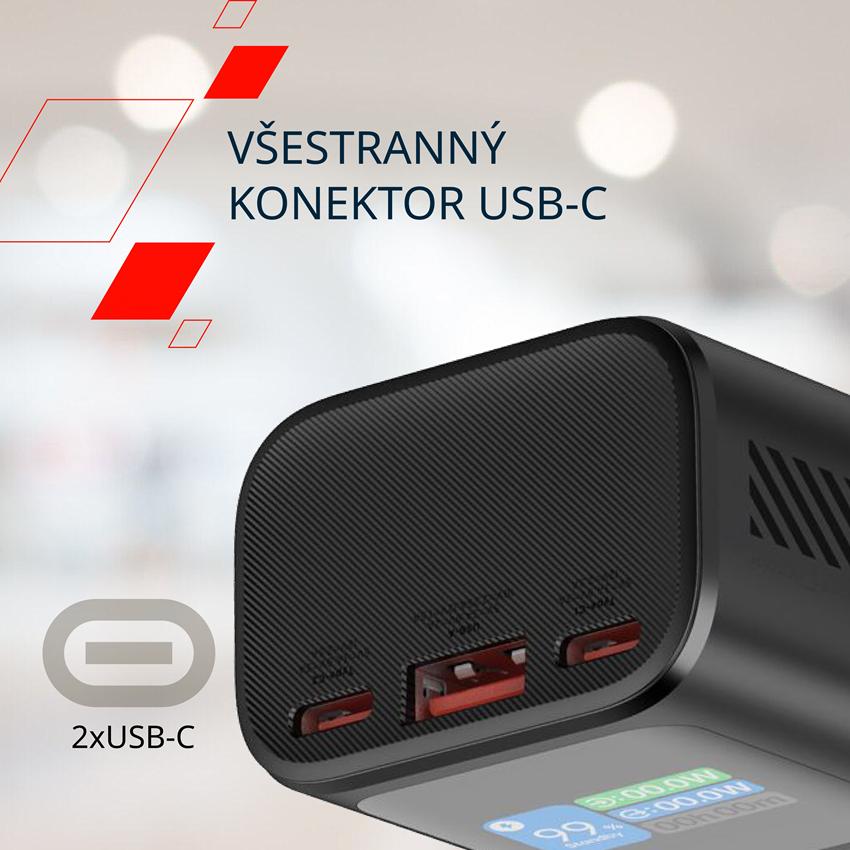 - 3 výstupy; 2xUSB typu C, 1xUSB-A
