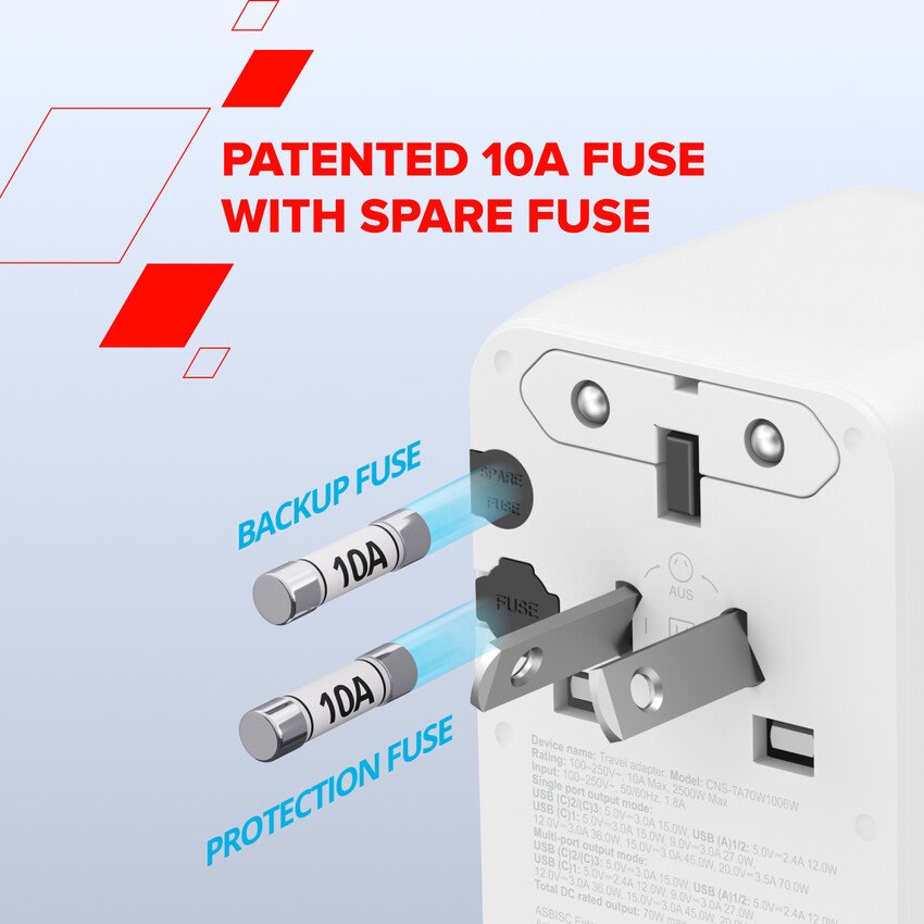 Canyon OnTour 70 je univerzální cestovní adaptér vytvořený pro profesionály a cestovatele, kteří potřebují nabíjet více zařízení najednou, a to bezpečně, rychle a v jakékoli zemi světa.