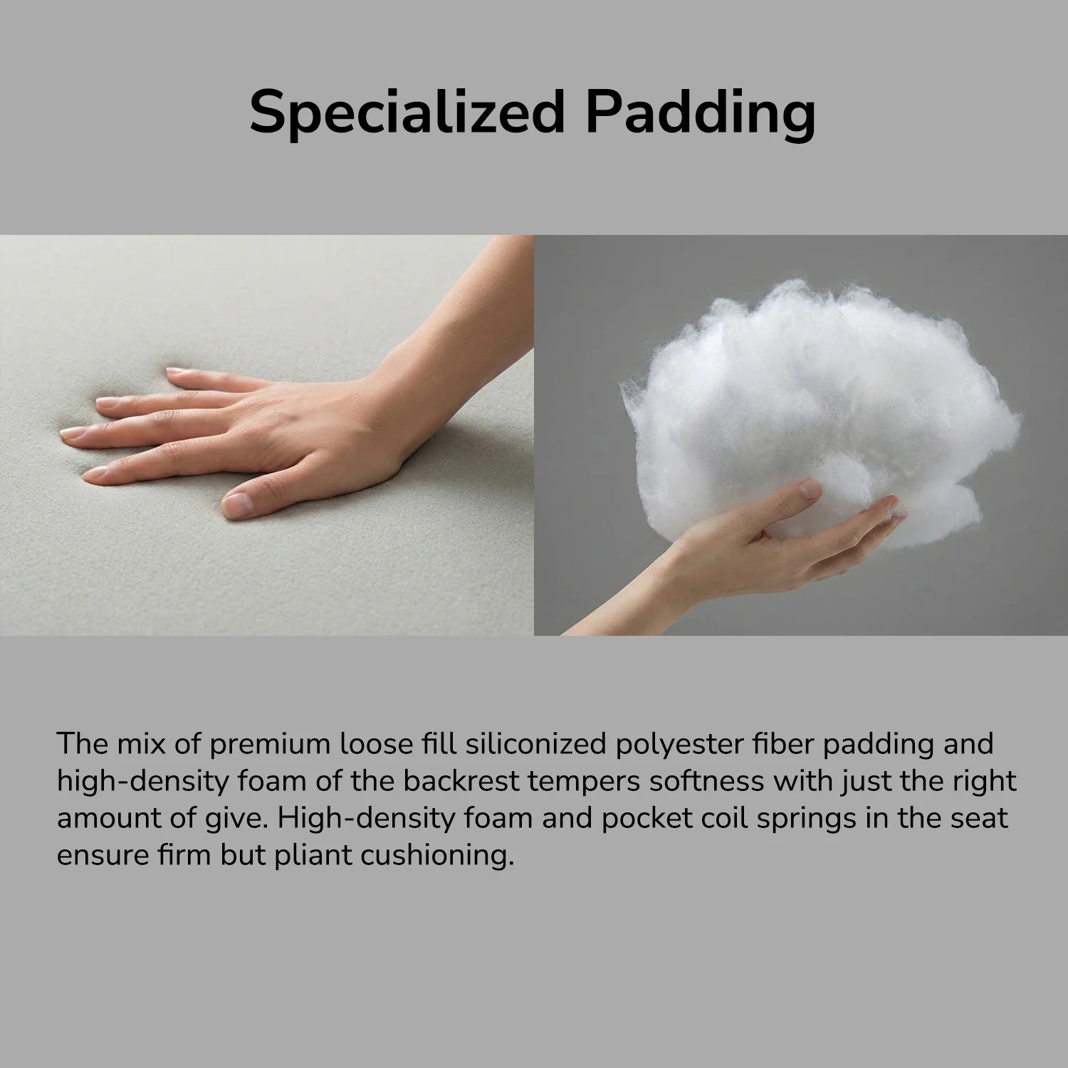Pokročilé polstrování: Kombinace paměťové pěny s vysokou hustotou a silikonizovaných polyesterových vláken v opěradle zajišťuje ideální rovnováhu mezi měkkostí a oporou. Sedák obsahuje taštičkové pružiny pro dlouhou životnost a pohodlí.