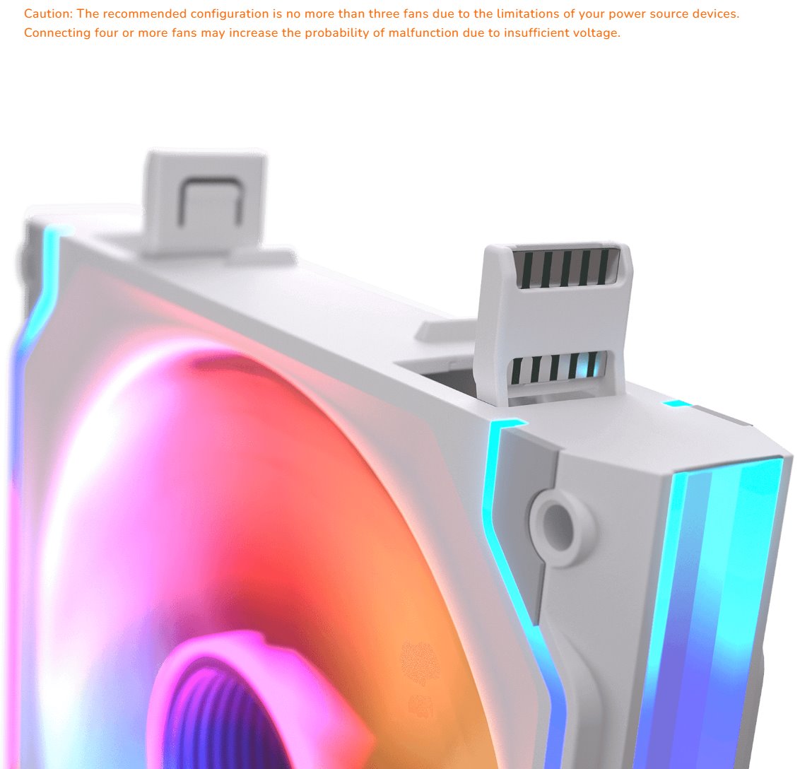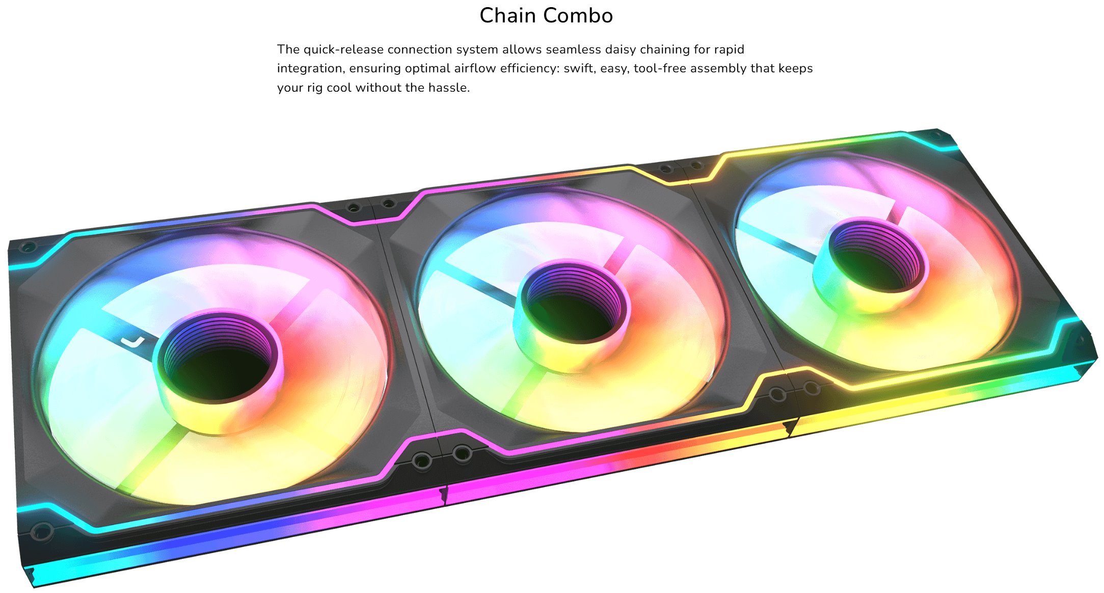 Systém rychlého připojení umožňuje bezproblémové řetězení pro rychlou integraci a zajišťuje optimální účinnost proudění vzduchu: rychlá, snadná montáž bez použití nářadí, která udržuje vaši sestavu chladnou bez potíží.
