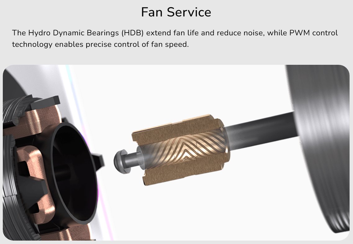Hydrodynamická ložiska (HDB) prodlužují životnost ventilátoru a snižují jeho hlučnost, zatímco řídicí technologie PWM umožňuje přesné řízení otáček ventilátoru.