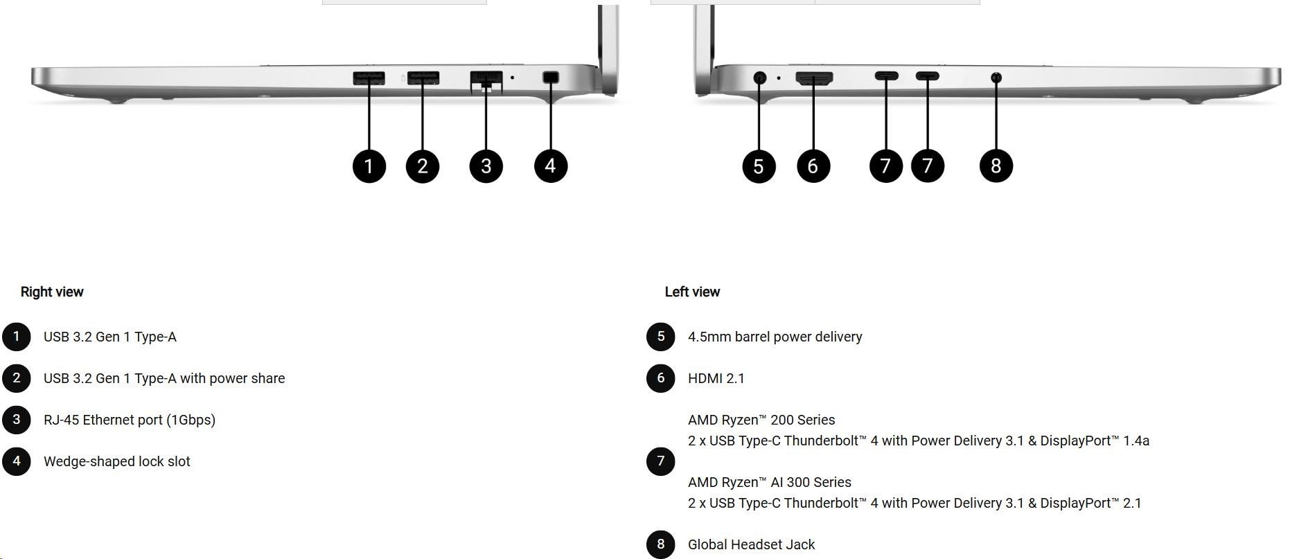 Zařízení nabízí dobrou konektivitu včetně portů USB-C s podporou Power Delivery a DisplayPort, USB-A portů a HDMI 2.1 pro připojení externích monitorů nebo projektorů. Notebook má také RJ-45 Ethernet pro pevné síťové připojení a kombinovaný audio jack. Vestavěná FHD HDR + IR kamera s mikrofonem a čtečka otisků prstů zvyšují komfort a bezpečnost při každodenním používání.