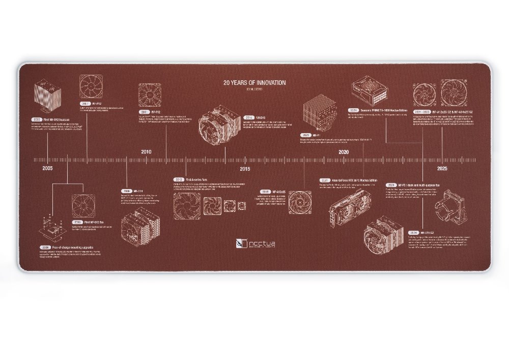 Noctua NP-DM3 je vysoce kvalitní desková podložka s unikátním designem časové osy, která připomíná klíčové milníky značky Noctua od roku 2005 až po nejnovější G2 modely.