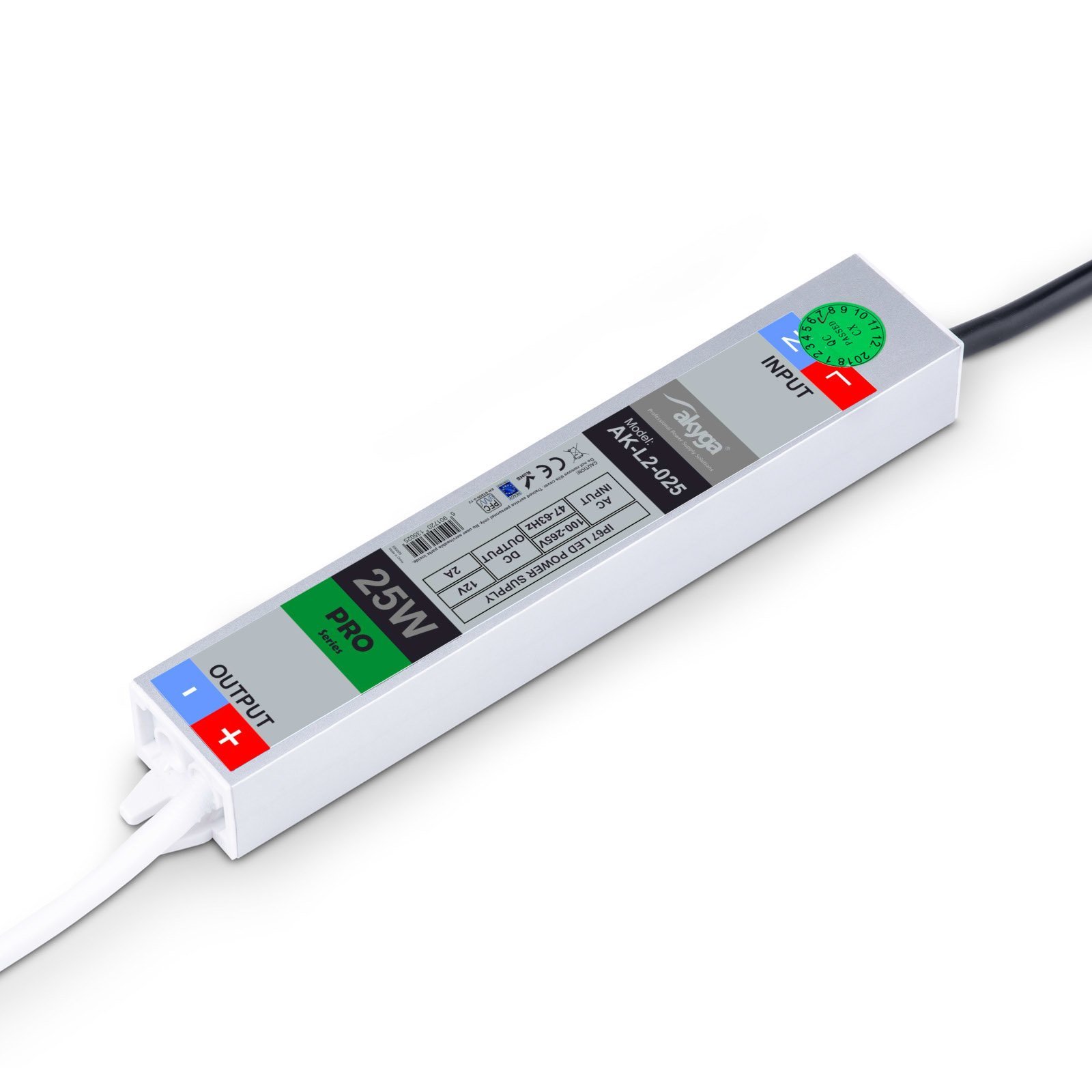 Akyga® AK-L2-025 je 25W napájecí zdroj pro průmyslové automatizační systémy, řízení strojů a osvětlení založené na technologii LED, který se používá při napájení LED pásů, LED žárovek, LED panelů, LED ovladačů RGB a dalších elektronických zařízení poháněných 12V DC a díky vodotěsnému krytu IP67 funguje i uvnitř a venku. Aktuální kapacita 2A umožňuje dodat 5m LED pás (4,8 W/m).