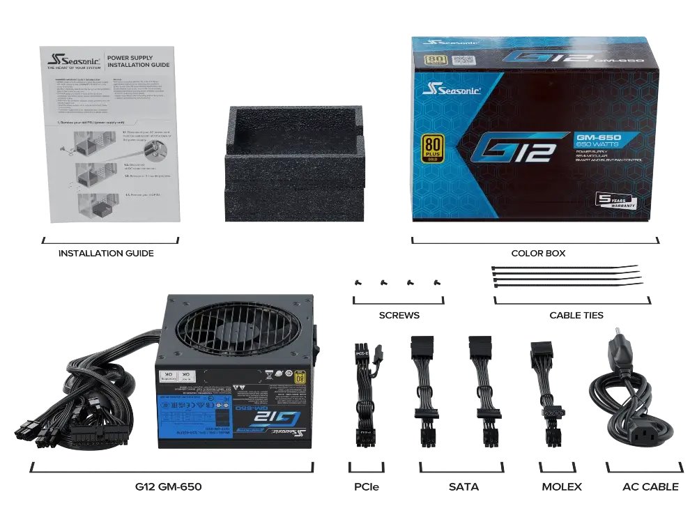 Seasonic G12 GM – 650 W je napájecí zdroj ve formátu ATX s certifikací 80PLUS® Gold, který nabízí vysokou účinnost a stabilní výkon. Využívá technologii LLC resonant converter a inteligentní řízení ventilátoru Smart and Silent Fan Control (S2FC) pro tichý provoz. Díky semi-modulární kabeláži je instalace přehledná a umožňuje lepší správu kabelů.